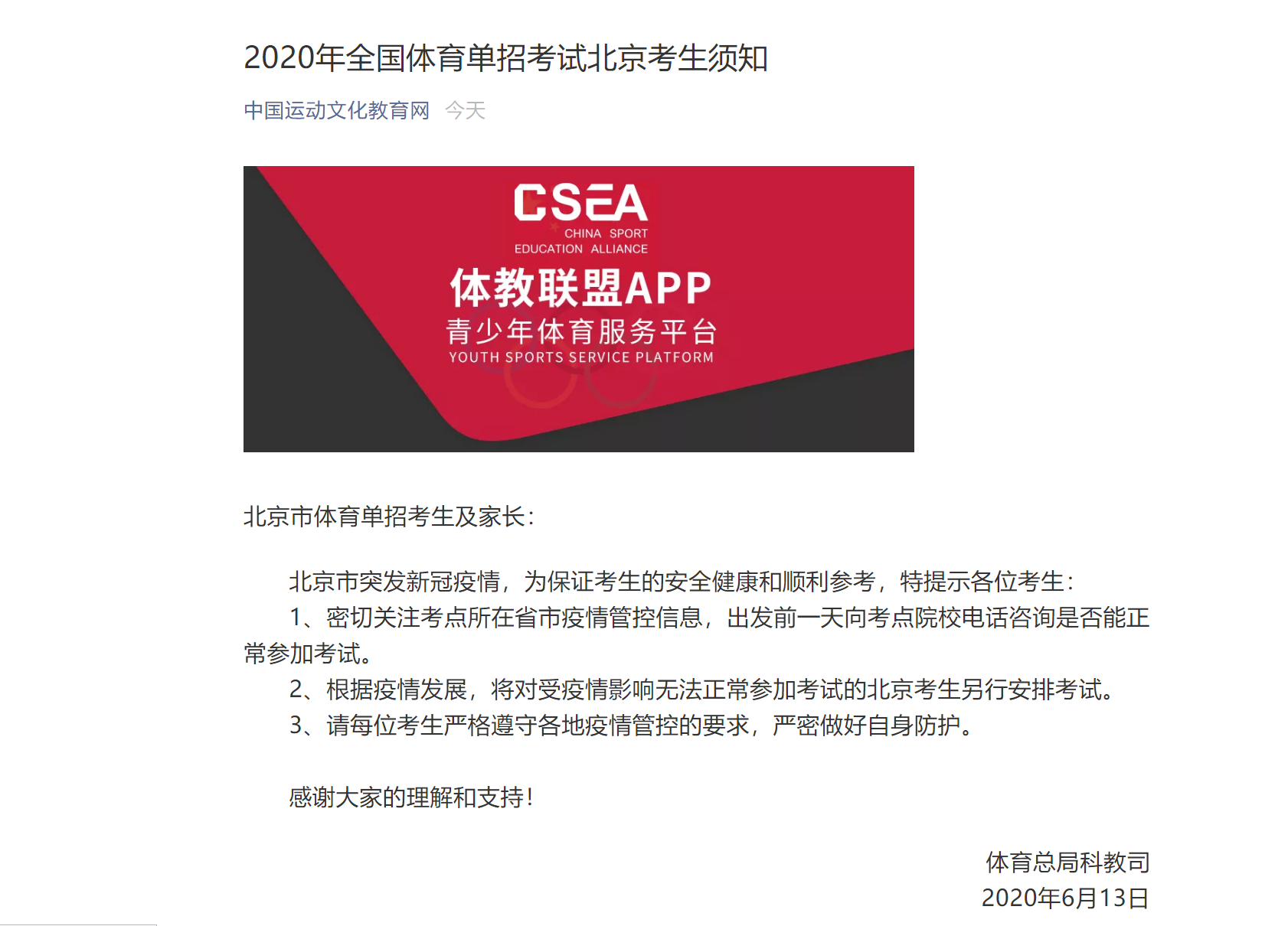 2020年全国体育单招考试北京考生须知