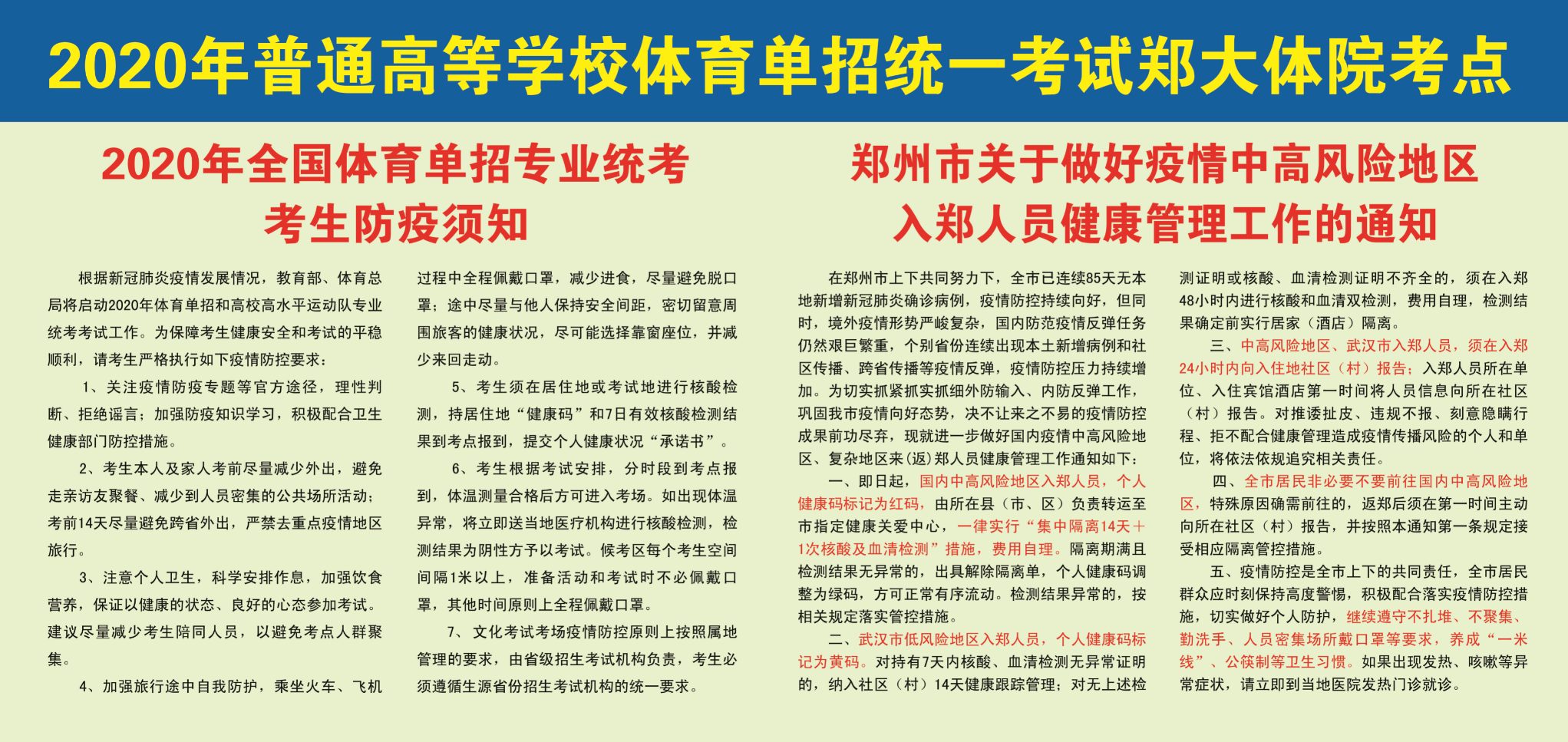 2020年全国体育单招专业统考郑大体院考点考生防疫须知