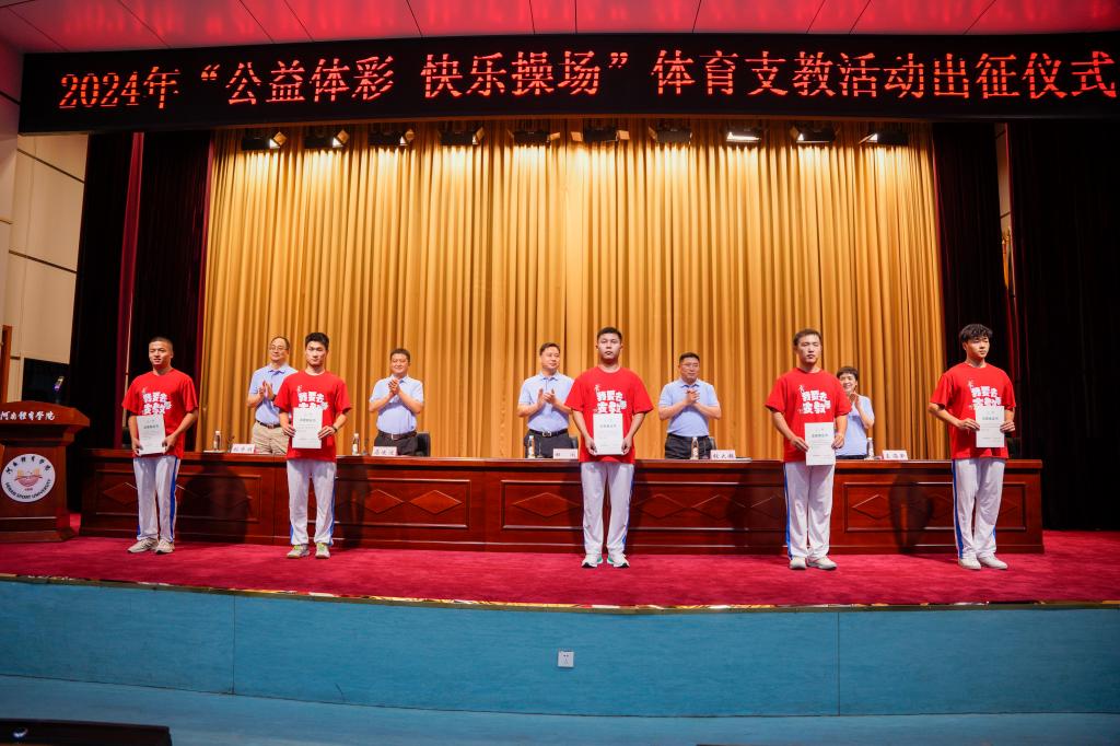 本次支教活动为期四个月,是我院对乡村教育振兴的坚定承诺和使命践行。副院长张学领,省体彩中心主任王海新、省体育局青少处副处长马运波,体育教育系负责人出席仪式。