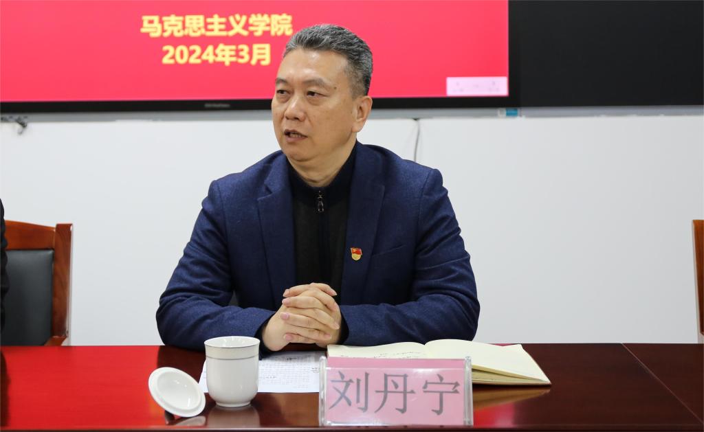 刘丹宁在讲话中充分肯定了马克思主义学院成立以来取得的成绩,回顾和总结了五年来学院思想政治理论课教育、教研等工作。刘丹宁指出,2019年3月18日,习近平总书记主持召开学校思想政治理论课教师座谈会并发表了重要讲话,为我们指明了办学方向和根本遵循。学院党委高度重视马克思主义学院建设,特别关注思政课教学质量。全体思政课教师要持续深入学习贯彻落实习近平总书记重要讲话精神,围绕立德树人根本任务,增强办好思政课的使命感责任感,发挥好思政课在立德树人中的关键作用,推动我院思想政治理论课教学质量再上新台阶。