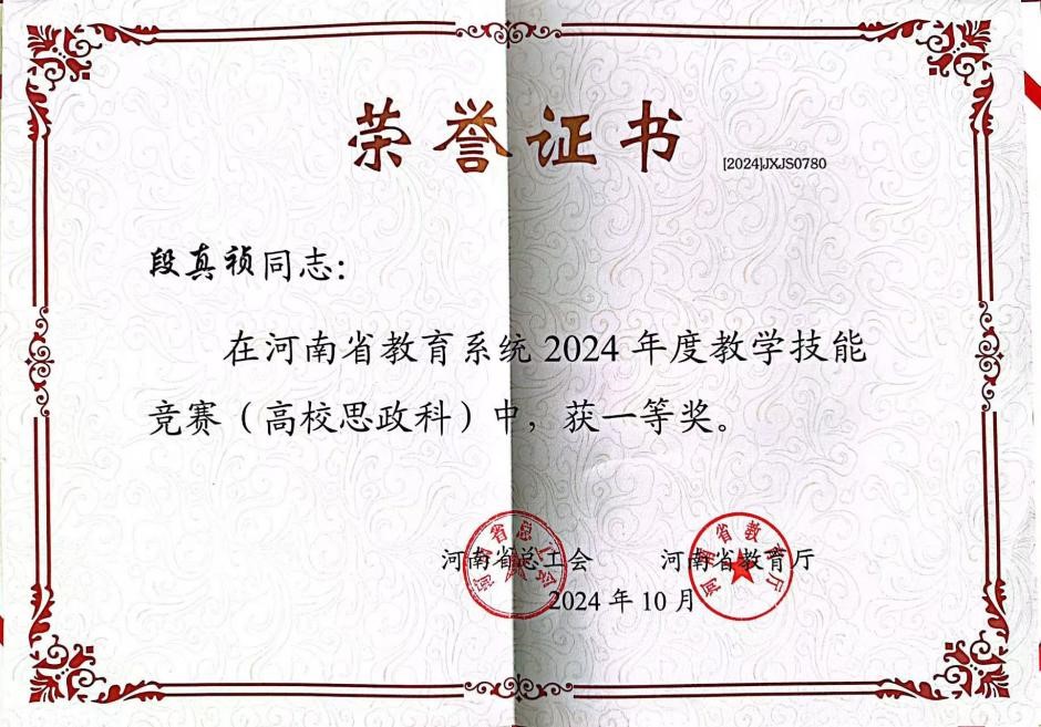 近日,根据《河南省总工会 河南省教育厅关于河南省教育系统2024年度教学技能竞赛获奖情况的通报》(豫工文〔2024〕89号),我校马克思主义学院段真祯老师获得高校思政科一等奖。这是我校在河南省教育系统教学技能竞赛中取得的又一成果。