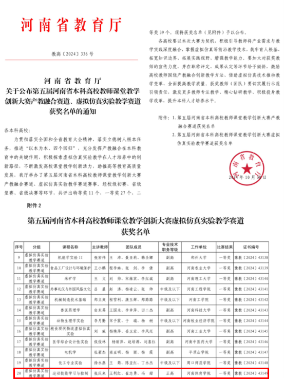 近日,河南省教育厅发布了第五届河南省本科高校教师课堂教学创新大赛(虚拟仿真实验教学赛道)的获奖结果,我校体育教育系主任、博士生导师张庆来教授的《运动技能学习与控制》课程脱颖而出荣获一等奖,展现了学校在教育教学创新方面的成果。
