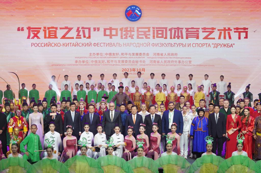 10月11日,由中俄友好、和平与发展委员会和河南省人民政府共同举办的“友谊之约”中俄民间体育艺术节在郑州开幕,中俄友好、和平与发展委员会中方主席,中央港澳工作办公室主任、国务院港澳事务办公室主任夏宝龙出席开幕式并致辞。中俄友好、和平与发展委员会俄方主席季托夫线上致辞,省委书记楼阳生、俄罗斯驻华大使莫尔古洛夫致辞,省长王凯主持。