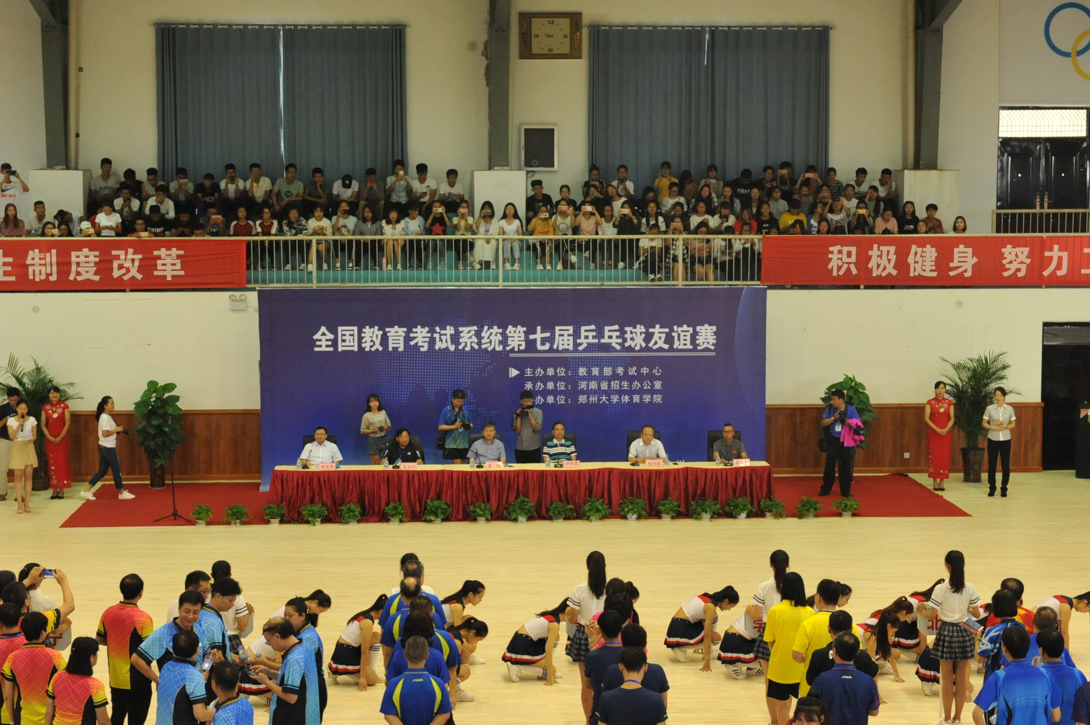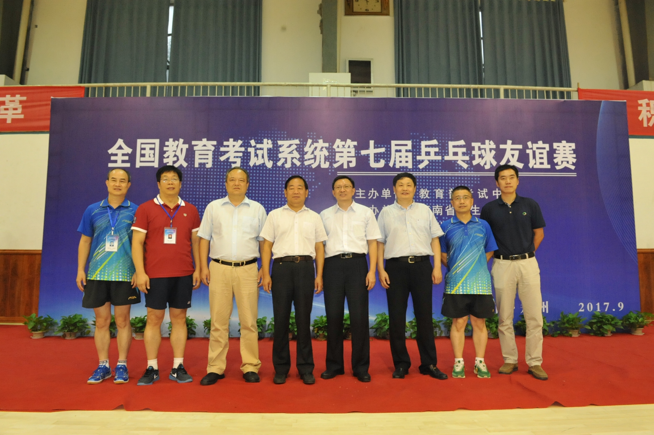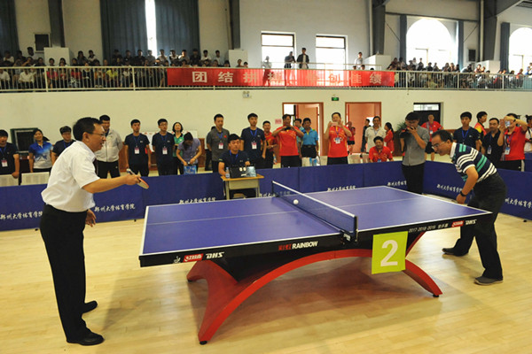 9月23日上午8点30分,2017年全国教育考试系统第七届乒乓球友谊赛开幕式在我院登封校区隆重举行。教育部考试中心主任姜钢,河南省教育厅副厅长尹洪斌,河南省招生办公室主任朱玉山,教育部考试中心党委副书记兼纪委书记李光明,我院院长张绍通出席开幕式。开幕式由教育部考试中心党委副书记兼纪委书记李光明担任主持。省招生办公室主任朱玉山致词,我院院长张绍通致欢迎辞,教育部考试中心主任姜钢宣布:“全国教育考试系统第七届乒乓球友谊赛开幕”。 本次比赛由教育部考试中心主办,河南省招生办公室承办,郑州大学体育学院协办,共吸引来自全国教育考试系统24支代表队总计180余人参加比赛。比赛日期自9月22日至24日,历时三天。
