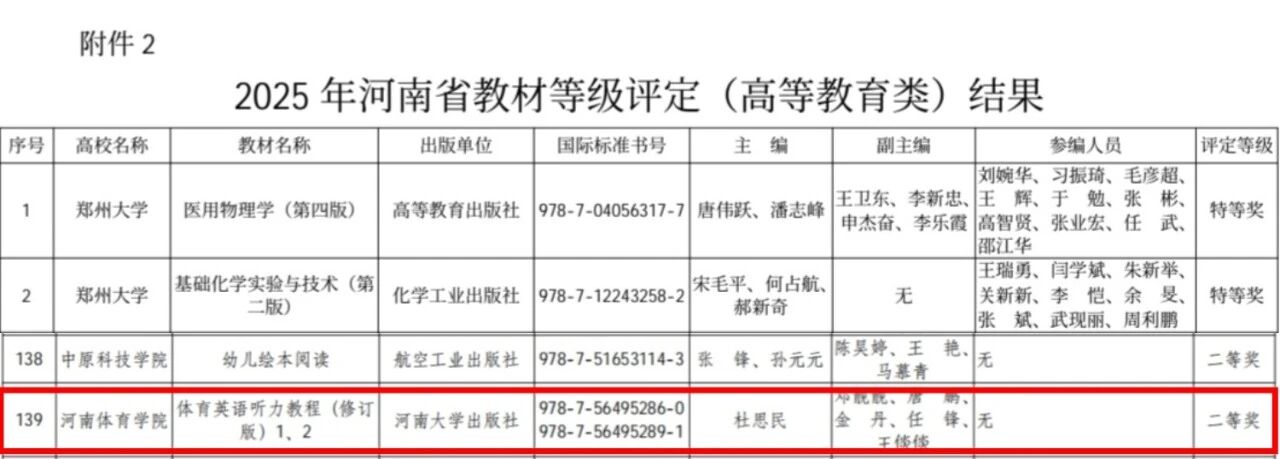 近日,河南省教育厅办公室印发《关于公布河南省教材等级评定结果的通知》(教办思政〔2025〕259号)。我校推荐申报的《体育英语听力教程(修订版)》教材在此次评定中获评二等奖。这一荣誉的取得不仅是对教材编写团队专业能力的高度认可,更标志着我校在教材建设与教育教学改革领域取得标志性突破。