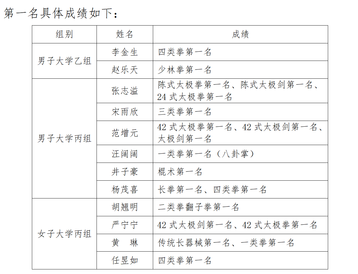 在激烈的角逐中,我校选手发挥稳定、技压群雄,多个项目取得突出成绩。张志溢同学在男子大学丙组中一举夺得陈式太极拳、陈式太极剑和24式太极拳三项第一;范增元同学包揽42式太极拳、42式太极剑和太极剑三项冠军;杨茂喜同学在长拳与四类拳项目中双双夺魁。此外,李金生、赵乐天、宋雨欣、汪阔阔、井子豪、胡翘明、严宁宁、黄琳、任昱如等同学也在各自参赛项目中勇夺第一,展现出全面的武术素养与扎实的训练功底。