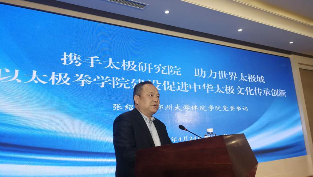 张绍通书记在上午举行的“太极拳文化传承发展研讨会”中做了“携手太极研究院,助力世界太极城,以太极拳学院建设促进中华太极文化传承创新”的主题发言,张书记指出,“身为‘太极圣地’河南省唯一的体育院校,郑州大学体育学院不仅拥有全省最强、国内一流的现代体育综合平台,而且具备世界领先水平的太极拳专业师资队伍和太极文化传承创新平台。目前,郑州大学体育学院联合温县、焦作市、河南省体育局、河南省政府、国家体育总局武管中心以及相关企业,以‘产、学、研、政、经’协同创新为理念,以‘太极拳+教育+中医+旅游+互联网’为模式,精心创建的‘河南省太极拳学院’项目已经启动,并力争把这所凝聚着各界奉献与期待的太极拳学院建设成为集文化传承、人才培养、社会服务、产业开发为一体的河南省太极拳发展枢纽,理念先进、设施现代、特色引领、协同创新的国内高校太极教育中心,以太极拳为主要特色的中国武术跨文化传播高端平台,中国传统武术文化走向世界的桥头堡,服务“一带一路”倡议的中华太极文化国际交流基地。”