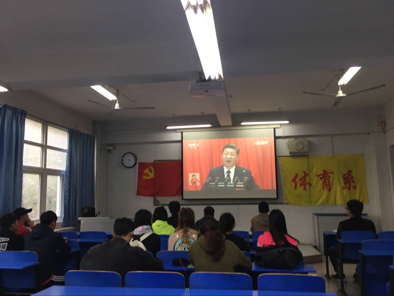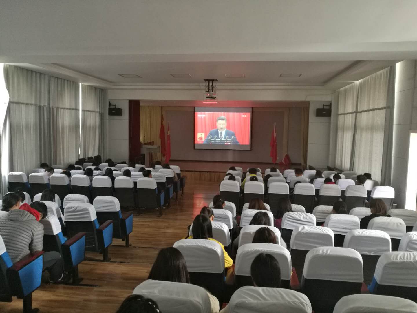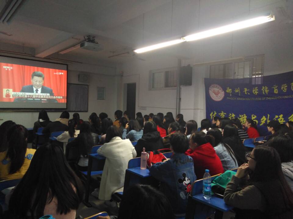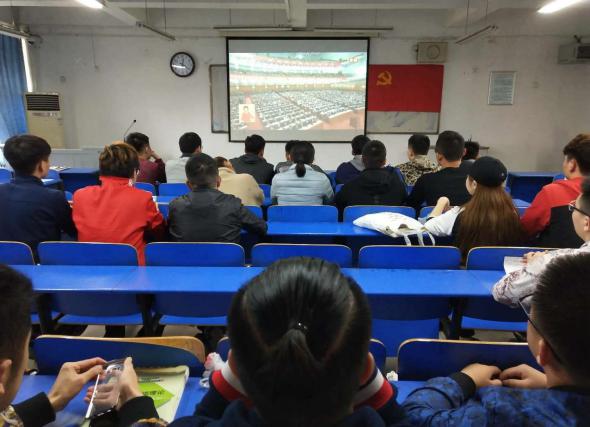 2017年10月18日,中国共产党第十九次全国代表大会在北京人民大会堂召开,根据中央、省委和上级党组织通知要求,我院在学术报告厅组织中心组(扩大)全体成员、全体无课的教职工和无课的学生党员,共一百余人收看开幕会实况,学院党委书记魏真在观看活动结束后发表讲话。院团学部门、登封校区、各教学单位也分别按照院党委要求,根据自身实际情况组织本部门学生观看开幕会直播。